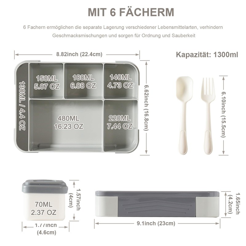 - MULTIPLE COMPARTMENTS - The Bento Box offers 1300ml capacity and 6 compartments, ideal for separating main dishes, side dishes and fruit. So the aromas stay fresh and do not mix, perfect for varied meals.