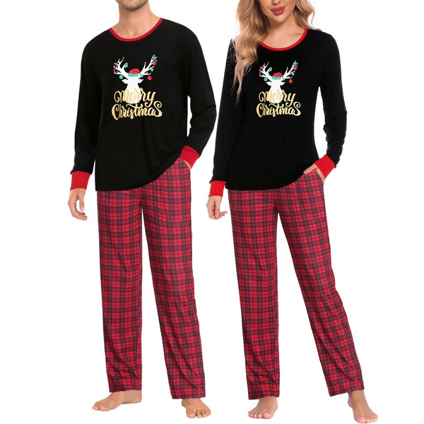 SWOMOG Couple Pajamas Set Christmas Matching Pjs Long Sleeve Set Xmas Printed Pajamas for Men&Women Plaid Pants with Pockets