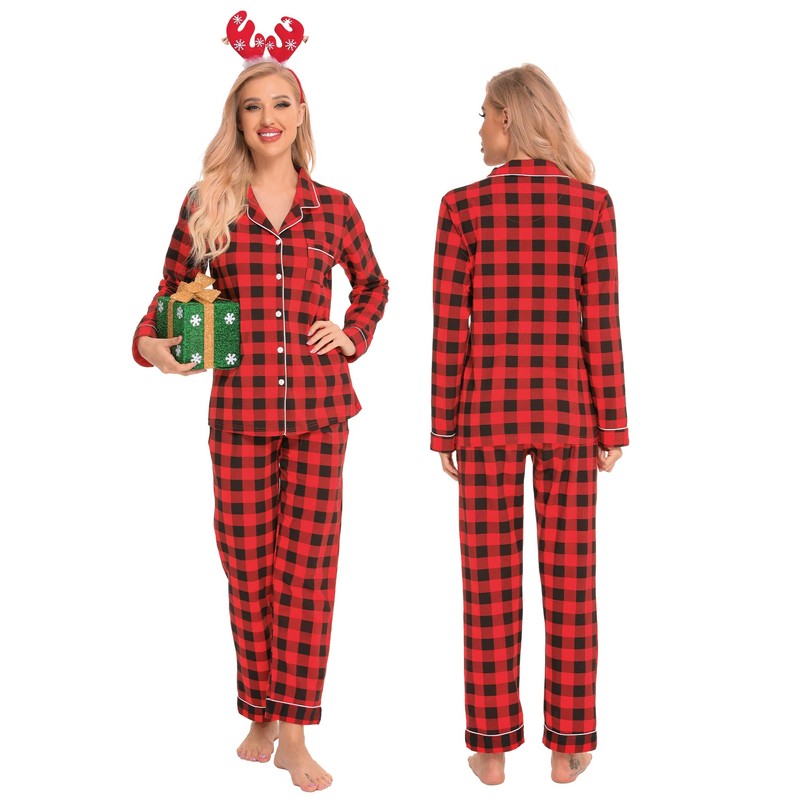 SWOMOG Couples Christmas Pajamas Set Women & Men Long Sleeve Pj Set Party Holiday Sleepwear Button-Down Loungewear Set womens Red With Black Grid Medium
