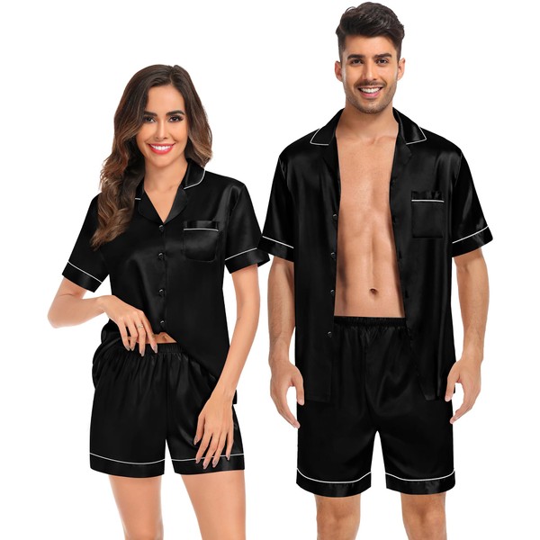 SWOMOG Couples Pajamas Matching Sets Silk Pj Set Sleep Sets for Women Button Down Pajamas Sleep Shorts Summer Lounge Sets Black