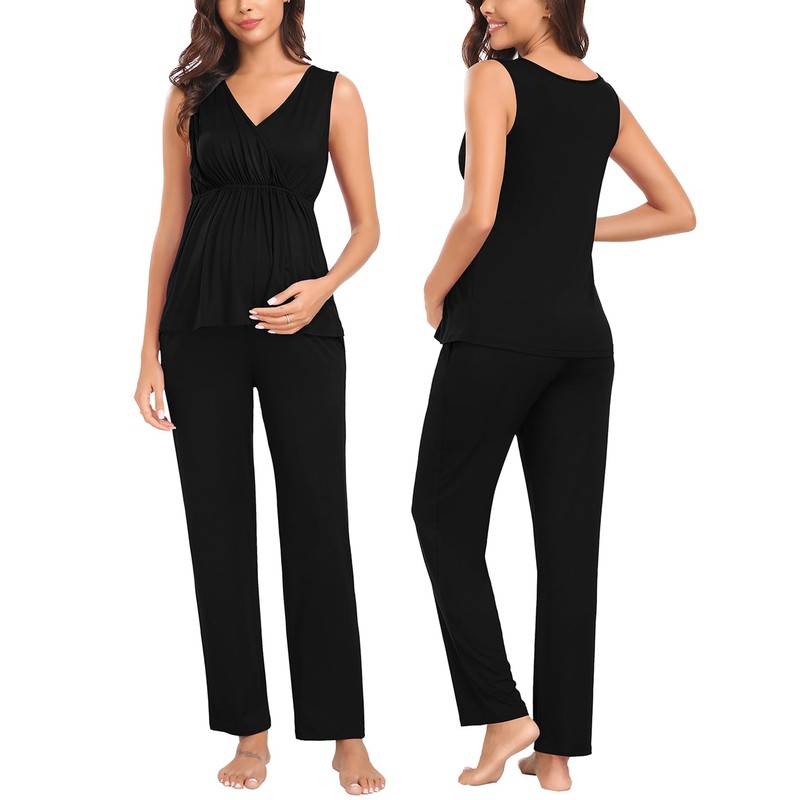Crafted from high-quality, stretchy fabric, this set is perfect for your growing bump, providing comfort and support throughout your pregnancy. The convenient nursing clips on the sleevless tops make breastfeeding a breeze, while the cozy long pants ensure a peaceful night's sleep for both mom and baby.