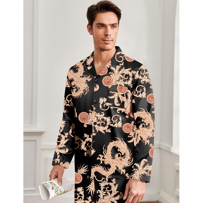 SWOMOG Men Pajamas Matching Pajamas Set Satin Pj Set Long Sleeve Button Down Sleepwear 2 Pcs Loungewear Black Dragon XX-Large