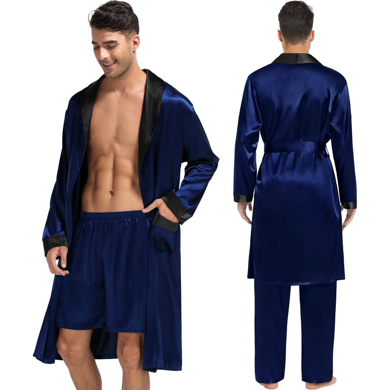- Features: 3-piece Classical kimono shawl collar bathrobe with a gorgeous and classy look. Nicely tailored satin robe set includes a knee-length, long-sleeve robe with two front pockets, adjustable/removable belt, and inside ties; shorts&pants with soft elastic waist, easily put on and take off.Very comfortable for wearing around the house,lounging,and before/after spicy activities