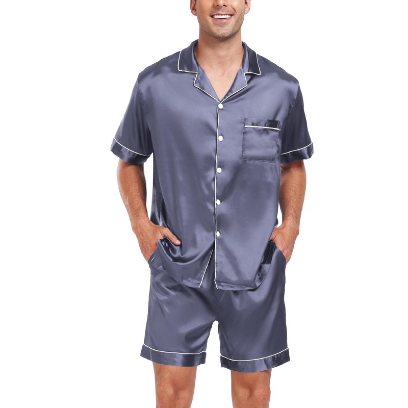 - PJS FEATURES - Men satin 2 piece Pjs set with short-sleeved button-down top and elastic waist shorts, easy to put on and off. Classic notch collar and chest pocket. Sleepwear with pockets to place your phone and wallet. Satin silk pajamas feature contras colors.