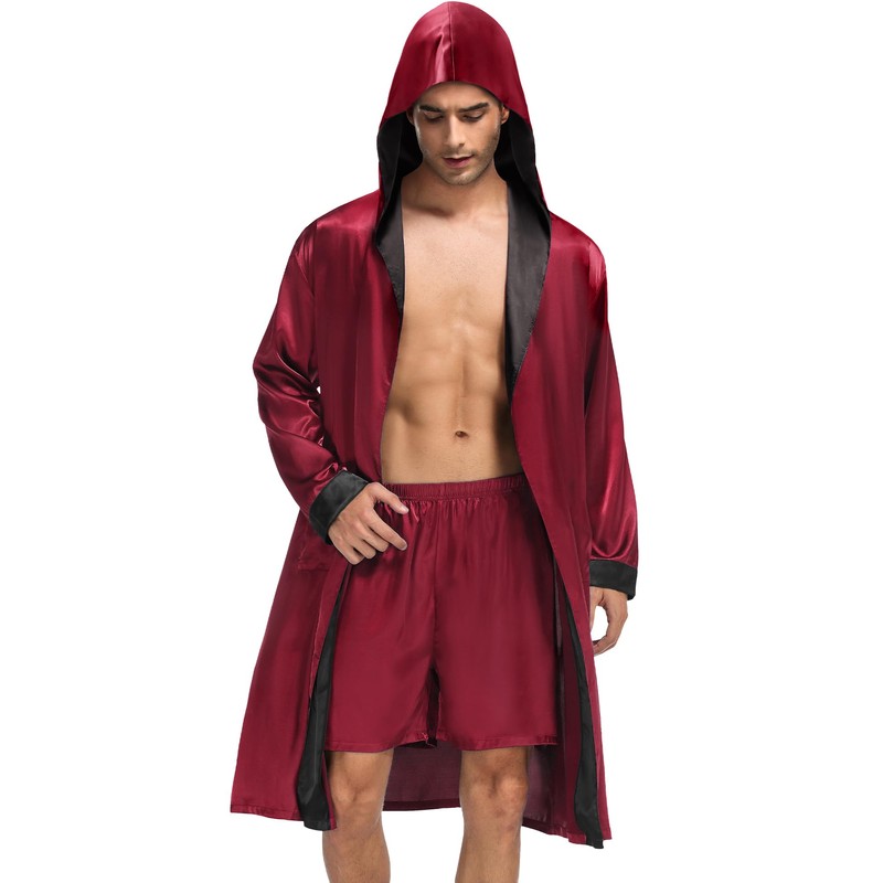 - Features: Men's Kimono bathrobe with hood included a wrap design boasts a shawl collar, hood, and ties at the waist, securing your robe; shorts with soft elastic waist, easily put on and take off