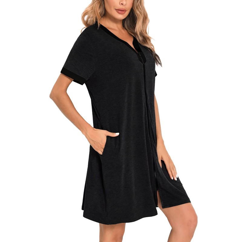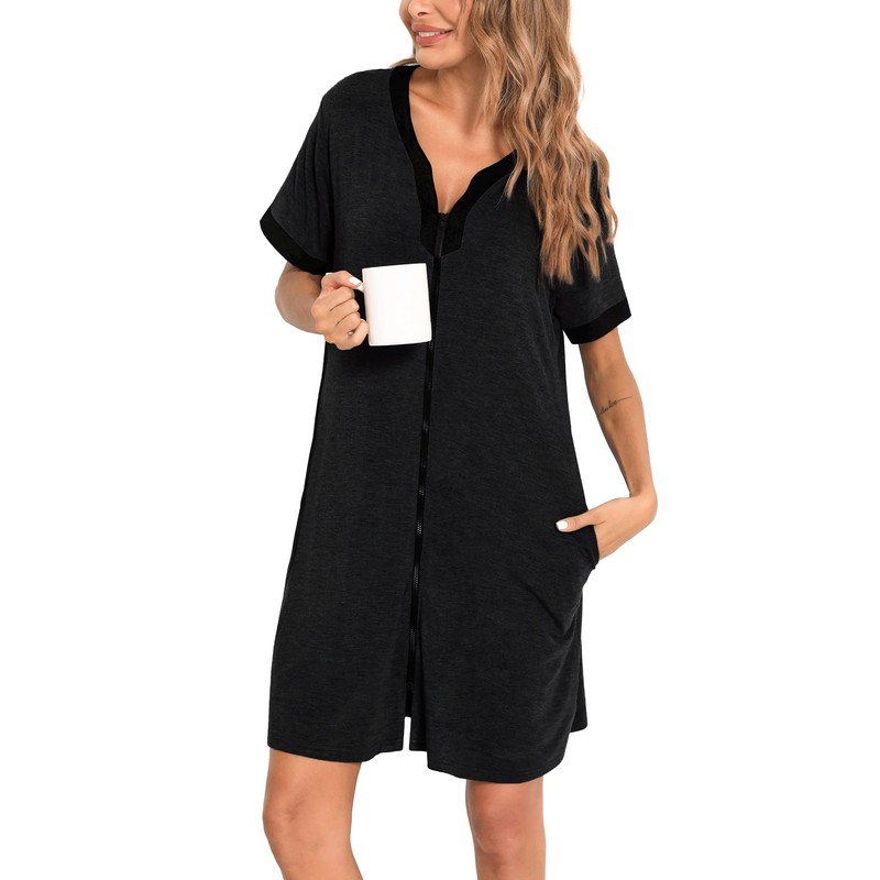SWOMOG Women Zipper Front House Coat Short Sleeves Robe Zip up Bathrobes Short Nightgown with Pockets S-3XL Black Dark Gray XX-Large