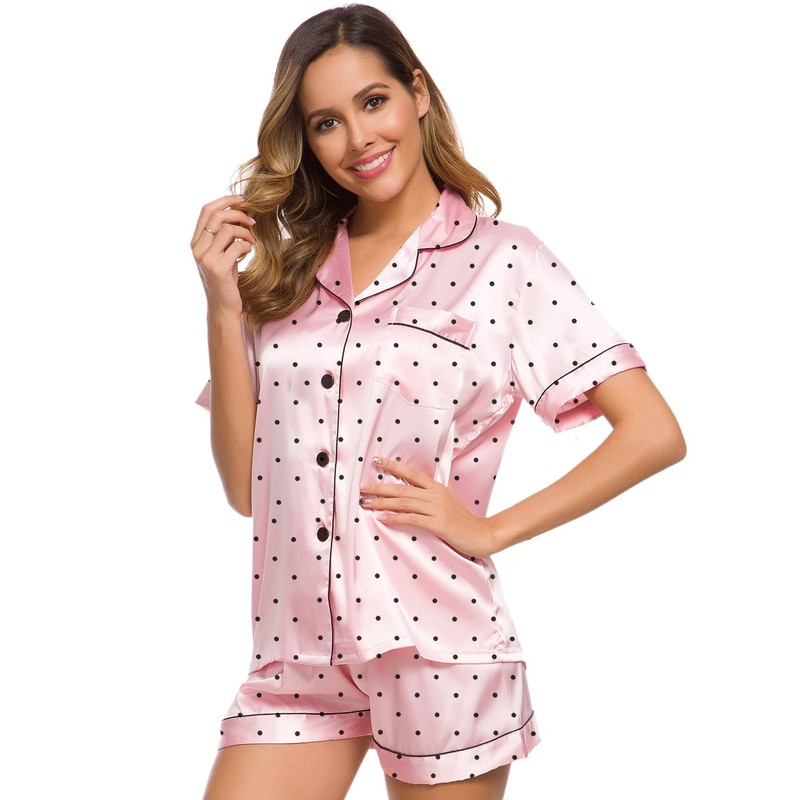 SWOMOG Womens Silk Satin Pajamas Set Short Sleeve Button Down Sleepwear Loungewear 2 Pcs Pj Sets Pink Dots X-Small