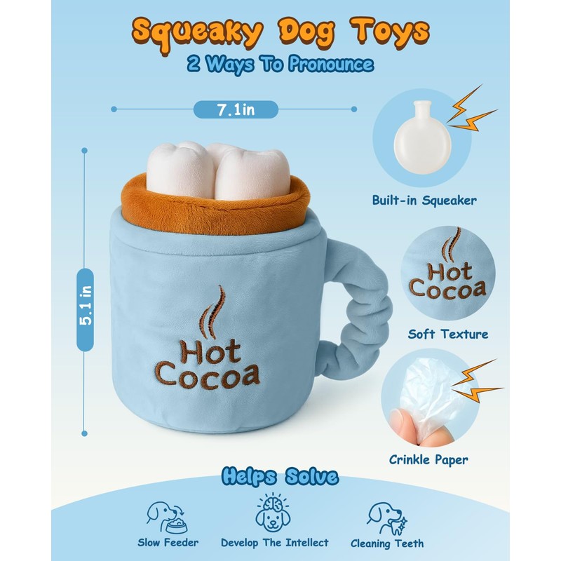 - Interactive Squeaky Design: Shaped like a coffee cup, this toy features a plush exterior, crinkle paper, and squeaky marshmallows, making it an engaging and interactive way to grab your dog's attention and keep them busy