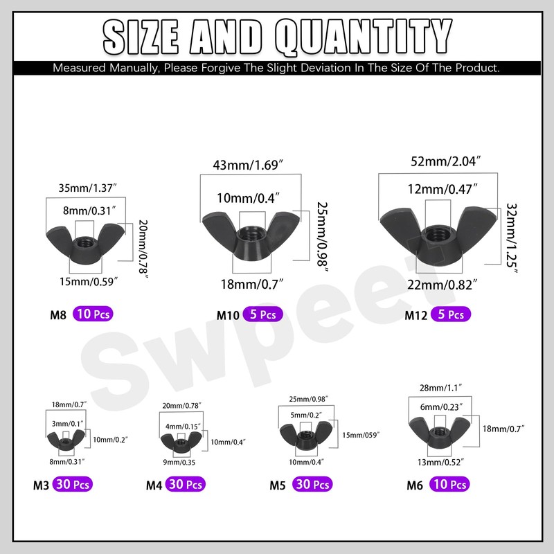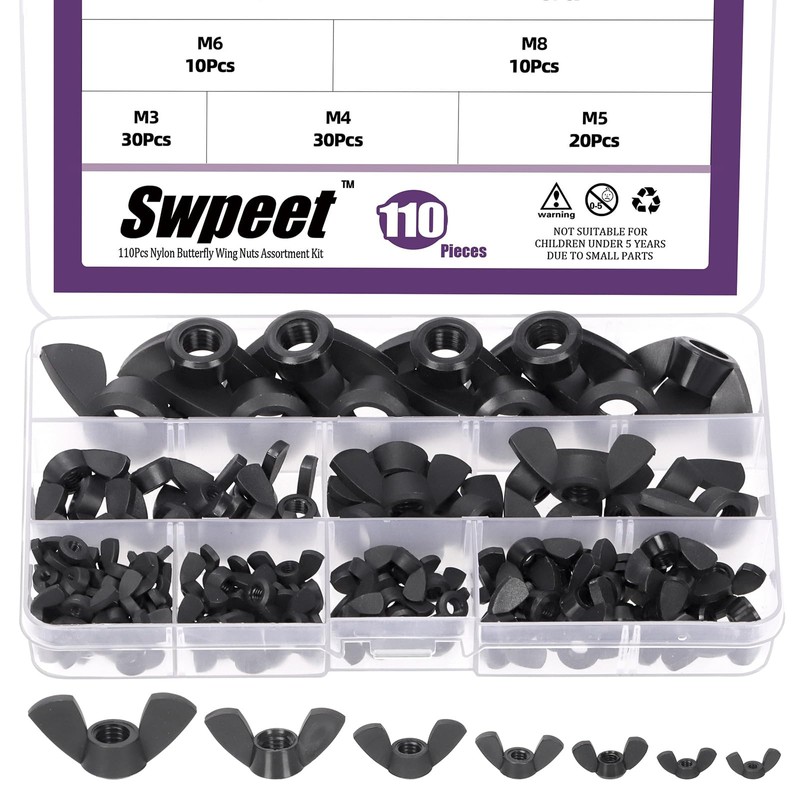 - 💯 What You Get ------ In this kit, You will get 110Pcs 7 Sizes M3 M4 M5 M6 M8 M10 M12 Metric Black Nylon Wing Nuts Butterfly Nut Assorment Kit, Including 30Pcs M3 Nylon Wing Nuts; 30Pcs M4 Nylon Wing Nuts; 20Pcs M5 Nylon Wing Nuts; 10Pcs M6 Nylon Wing Nuts; 10Pcs M8 Nylon Wing Nuts; 5Pcs M10 Nylon Wing Nuts; 5Pcs M12 Nylon Wing Nuts. Intotal 110Pcs. The item come with a sturdy plastic organizer box for convenient to store and carry.