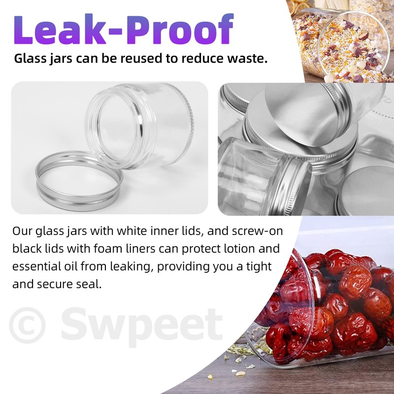 - Airtight and Leak Proof ------- Round Containers Cosmetic Glass Jars with Lids. Don't worry about getting your cosmetic bag wet! The travel cream jar's tight thread fits perfectly with the glass bottle cap to protect the lotion and essential oil from leaking. Our empty airtight glass jars can be reused to reduce waste.