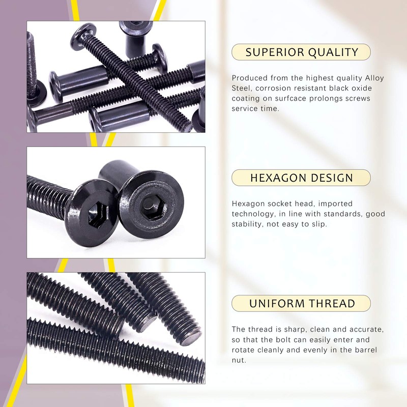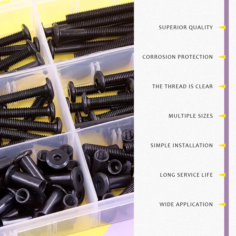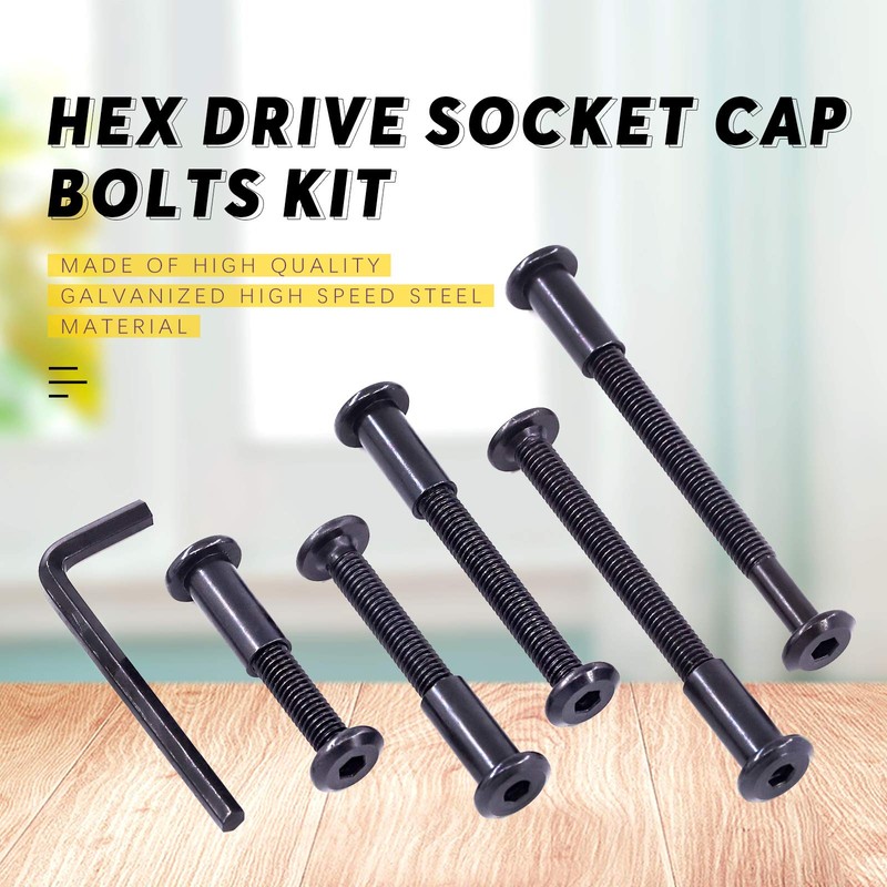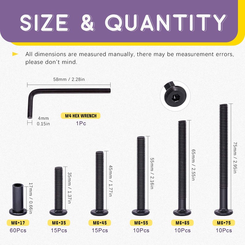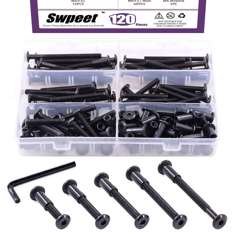 - ✿ 1, WHAT YOU GET ---- In this kit, You will get 120Pcs Carbon Steel Black Hex Drive Socket Cap Bolts Barrel Nuts Kit with 1Pcs Allen Wrench, Including M6x35mm: 25Pcs; M6x45mm: 15Pcs; M6x55mm: 10Pcs; M6x65mm: 10Pcs; M6x75mm: 10Pcs and M6x17 Nuts: 60Pcs. We now have a variety of sizes to choose from, you can choose whatever you need, which can fully meet your daily needs.
