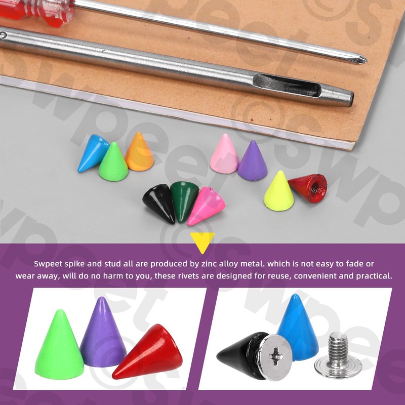 Swpeet 150 Sets 7X10mm Metal Cone Rivet and Screwbacks Kit with Installation Tools, Punk Metal Rivet Studs Rivets Screw, Leather Spikes for DIY Leathercraft Punk Style Clothing Accessories