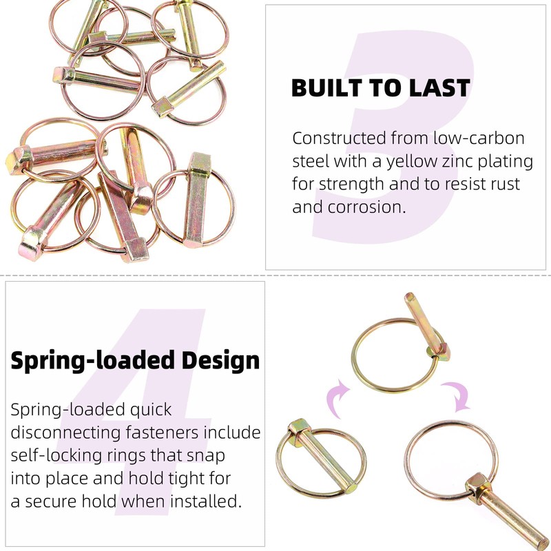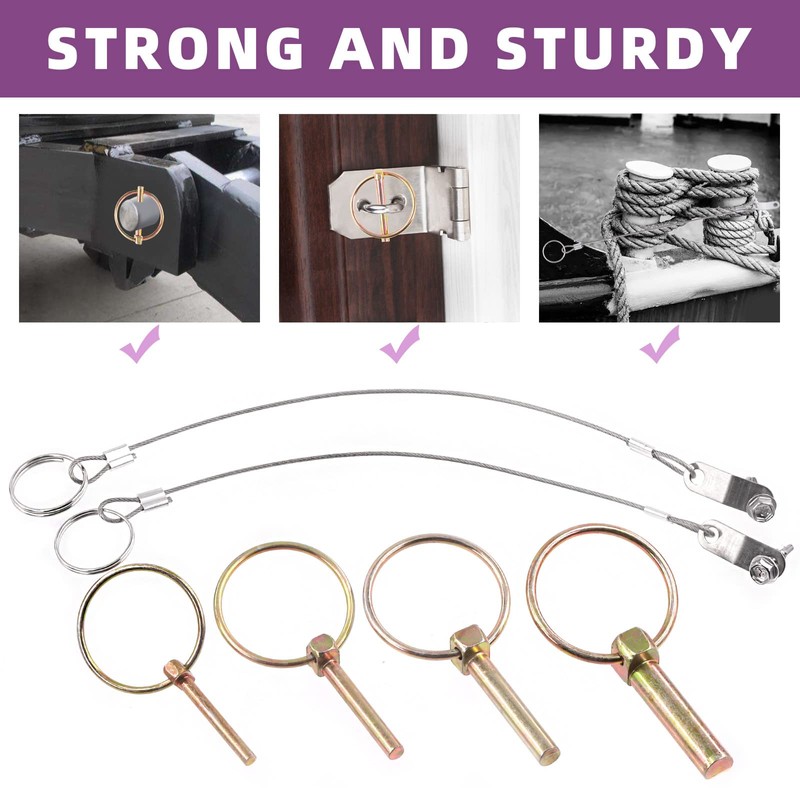 - 💢 10Pcs Lynch Pin Assortment Kit ------ Lynch pin rings are spring loaded to ensure a secure hold when installed. Including 4 Sizes: 3/16-inch x 1-7/16-inch, 1/4-inch x 1-3/4-inch, 5/16-inch x 1-3/4-inch, 7/16-inch x 1-3/4-inch. Trailer Hitch Lock includes a variety of common lynch pins (L-pins) that can be used to secure a wheel on an axle or to hold a trailer hitch.