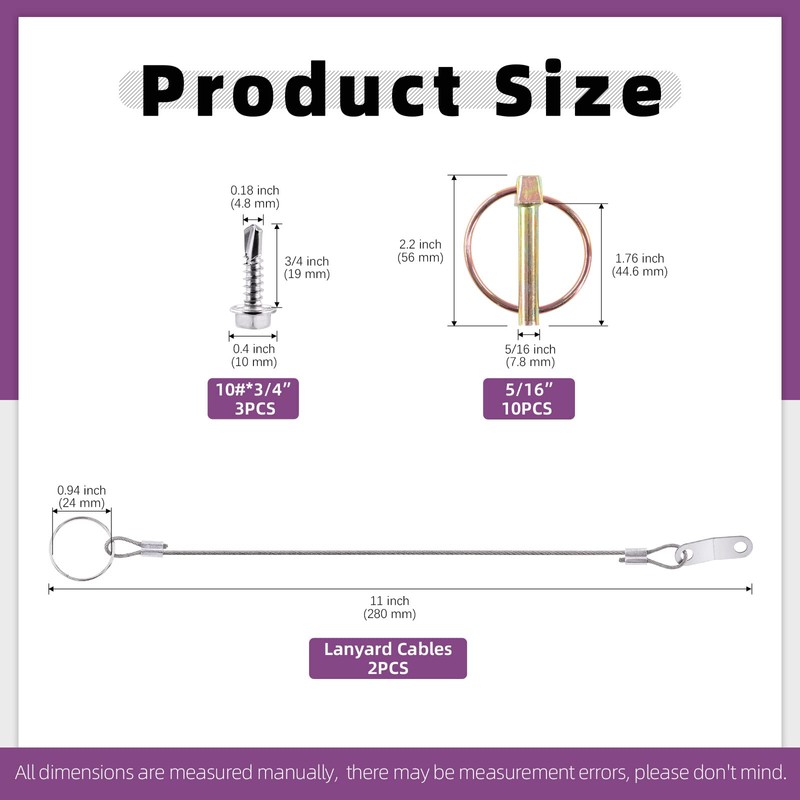 - 💢 What You Get ------ In this kit, You will get 15Pcs Lynch Pin L Pin Fastener Assortment Kit, Including 10Pcs 5/16 x 1"-3/4" Lynch Pins; 3Pcs 410 Stainless Steel Self Drilling Sheet Metal Screws #10x3/4" - #10x19; 2Pcs Stainless Steel Lanyard Cables with Quick Release Ring. Intotal 15Pcs can meet all your daily needs.