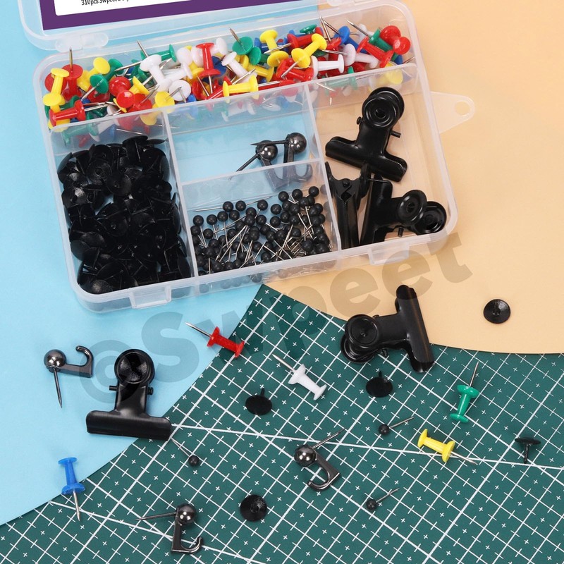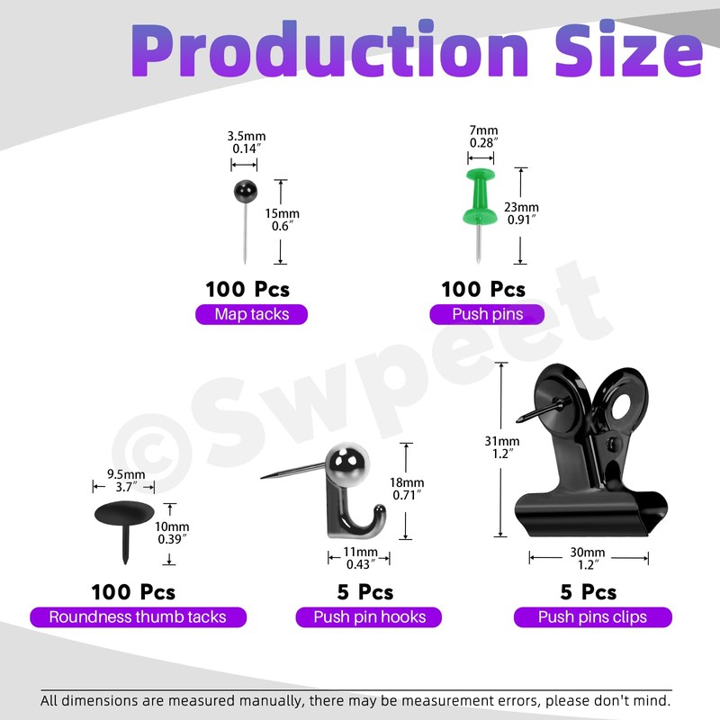 ✨ Dimensions: Map tacks: 0.6 Inch; Push Pins: 0.9 Inch; Thumb Tacks: 0.4 Inch; Push Pin Hooks: 0.7 Inch; Push Pin Clips: 1.2 Inch