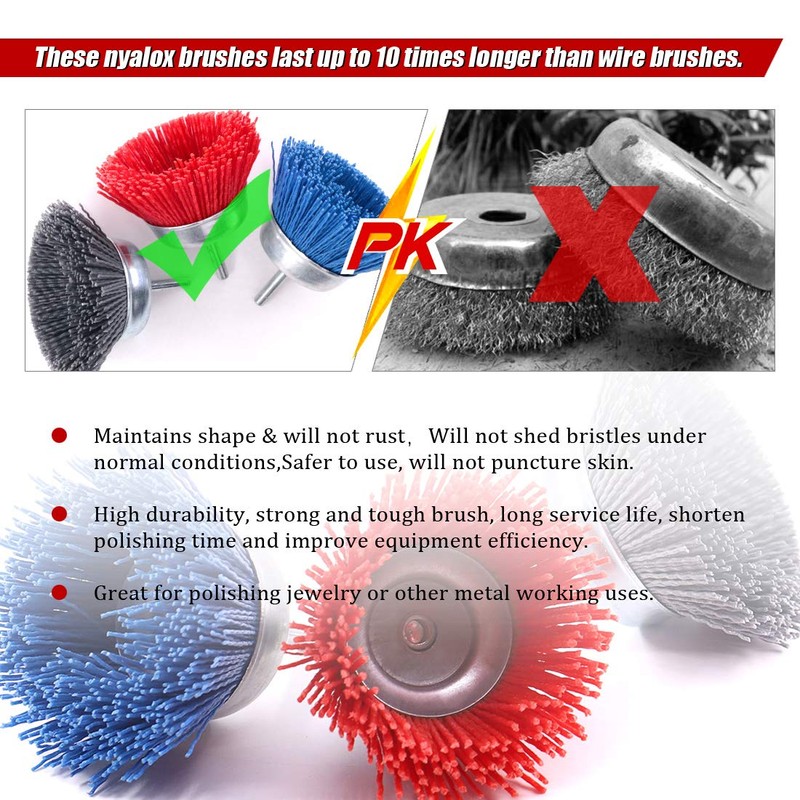 - ❤ 5, DESIGN REASONABLE --- Designed for easy access into narrow holes and confined areas. Crimped style for light to medium duty applications, Removes rust, scale and paint in hard to reach areas.Nylon cup and wheels abrasive Brushes mounted on 1/4 inch Hex shanks, Fits any drill or Impact Drivers.