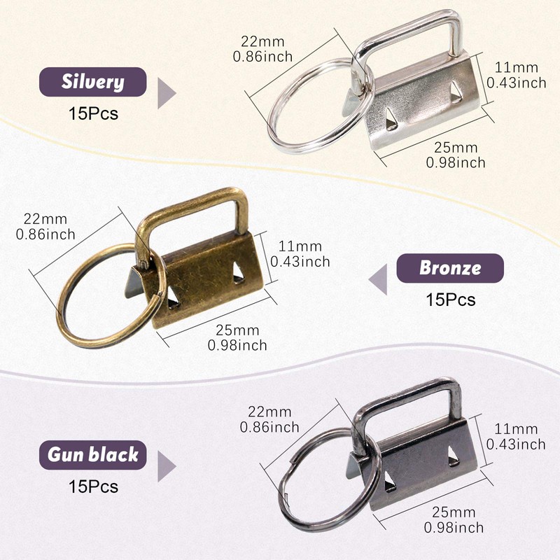 - ❤ 4, PRODUCT INFORMATION ---- In this set, You will get 45pcs assorted sizes Key Fob and 45Pcs Split Keyrings, Key Fob wide base: 1 Inch (25mm). Use For Wristlets with fabric, ribbon, webbing, embossed.