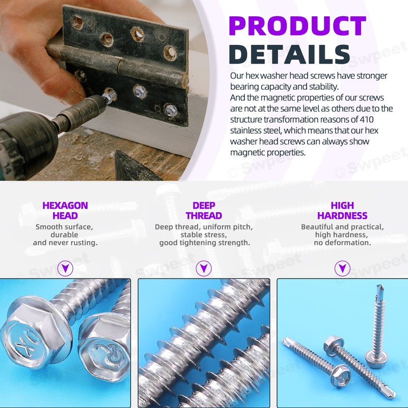- 💥【 410 Stainless Steel Self Tapping Screws 】 ------ These Hex Washer Head Self Drilling Screws are 100% 410 Stainless Steel which is one of the highest forms of corrosion resistant steel, Not like other uses 304 Stainless Steel, making it last longer than other hardware on the market today.