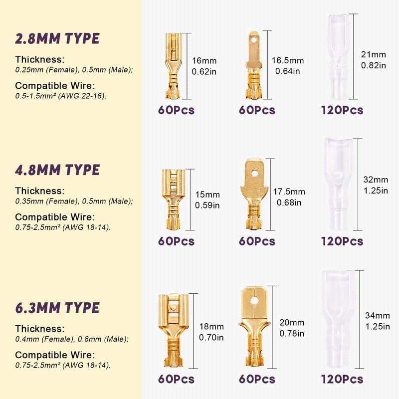 - Various sizes: plugs and sockets are available in three different sizes (2.8 mm, 4.8 mm, 6.3 mm) and are perfect for wires with a thickness of 22-14 and come in a transparent box for easy storage and carry.