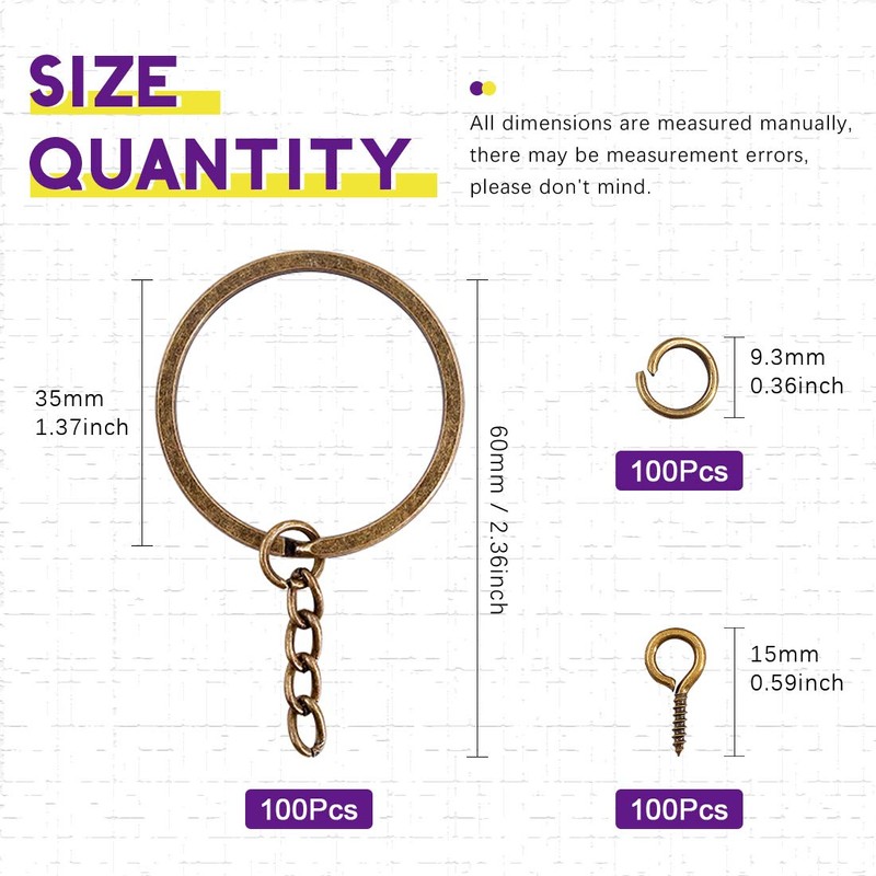 Swpeet Juego de 300 llaveros planos de bronce de 7/5 pulgadas de 35 mm, incluye 100 llaveros divididos con cadena y 100 anillos de salto con 100 pines de ojo de tornillo a granel para hacer accesorios de joyería