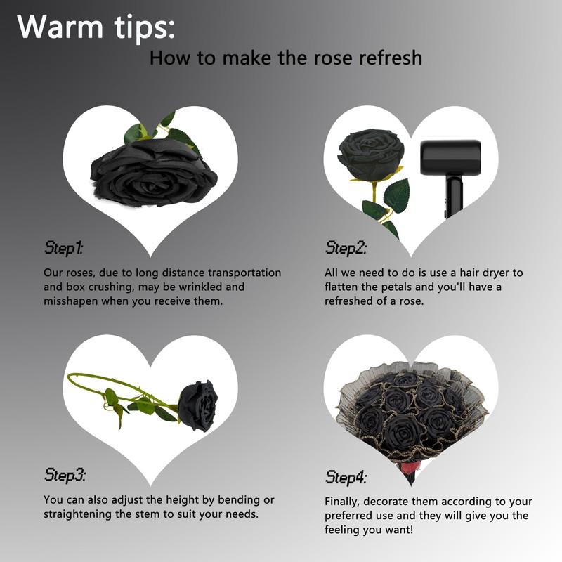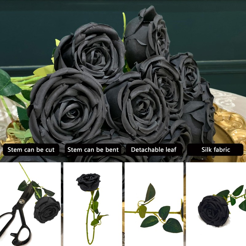 - EASY FLOWER ARRANGEMENT STYLING: Long stem black rose simulation flowers can be easily cut or bent stem adjusted to fit any height vase or flower arrangement shape, allowing you to create your own unique floral design; can be paired with a variety of home décor, party table centerpieces, add elegance and romance to any environment.