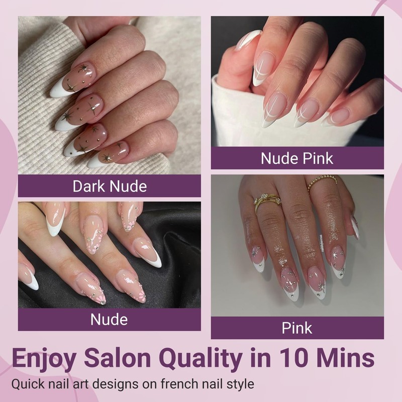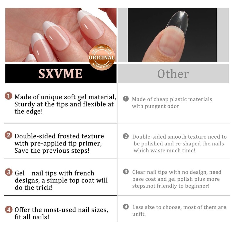 - Puntas de uñas de gel francesas neutras 3 en 1: (Incluye 300 piezas de puntas de uñas de almendra mediana SOLAMENTE, acabado mate) Uñas postizas SXVME con diseños franceses combinados con puntas de uñas de gel suave y cubierta de imprimación de punta precoloreada, ya no es necesario limar ni pulir, lo que hace que el proceso de manicura sea más fácil y rápido. La textura mate de doble cara puede eliminar la grasa de las uñas con anticipación para que las puntas de uñas de gel de almendra x se a
