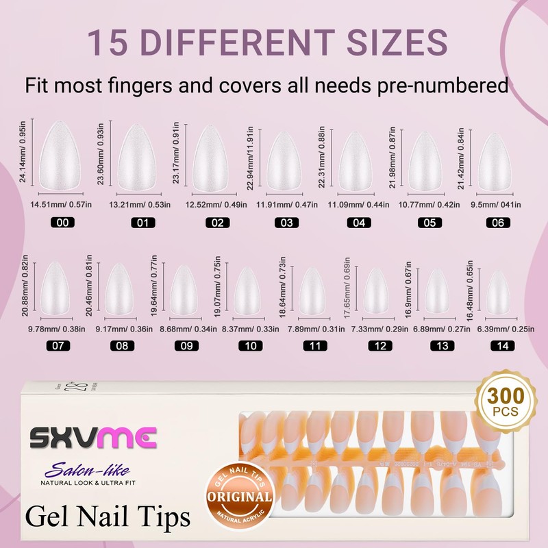 - Mejora 15 tamaños: se adaptan tanto a uñas planas como curvas: según la investigación profesional de tamaños de uñas de EE. UU., nuestras uñas de gel x brindan 15 tamaños que garantizan un ajuste totalmente personalizado, de 0 a 14, 20 puntas para cada tamaño, un total de 300 piezas de puntas. Estas uñas acrílicas se adaptan muy bien a tus cutículas y el grosor de la presión es perfecto. Estas puntas de gel en forma de almendra de longitud media son flexibles y lo suficientemente delgadas en el