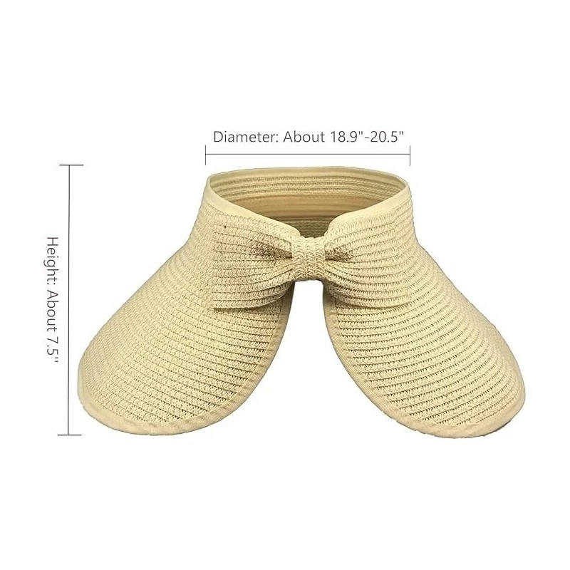 - Adjustable straw hats for women: The Sun Visor Hat comes with adjustable Velcro closure in the back side and one size adjustable fits almost of all head size. adjusting ranging from head circumference 22"-23.2". It is also suitable to wear even with various hair styles. With this top open sun hat, this visor makes it so easy to throw your hair in a messy bun or ponytail and not be over heated with a hat that covers your entire head.