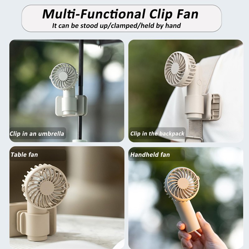 - 3 Modes to Choose From: This small fan can be used in 3 ways: 1.Clip fan, can be clipped to anywhere such as backpacks, umbrellas, strollers, etc. 2.Table fan, can be placed on desks, camping tables, bedside tables, etc. 3.Portable handheld fan to enjoy coolness anytime, anywhere