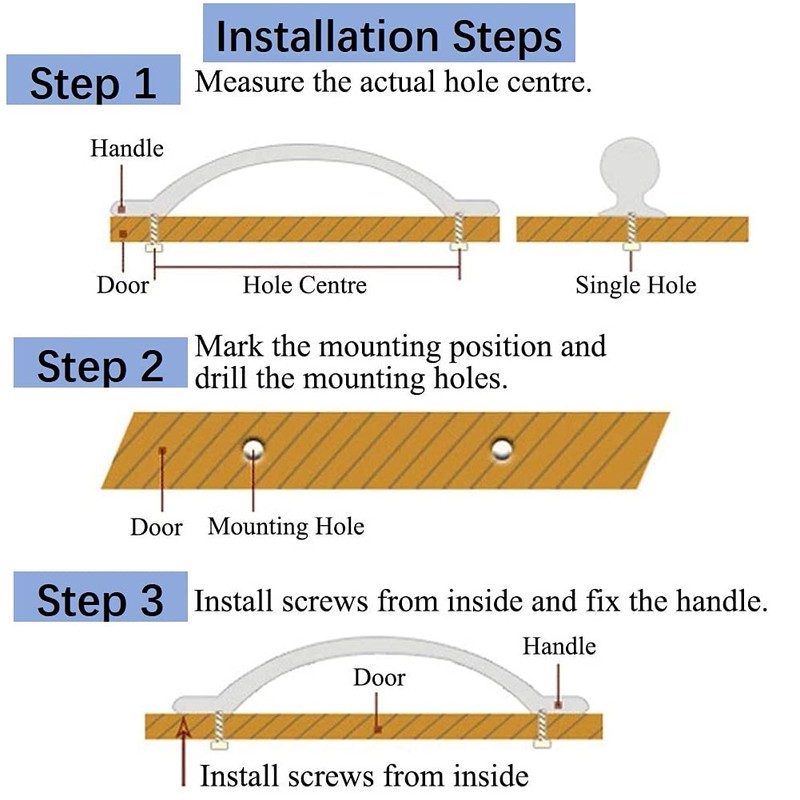 - EASY ASSEMBLY Mark the mounting position on your cabinet door/drawer according to the actual hole center and drill the mounting holes. Install screws from the inside and fix the handle.