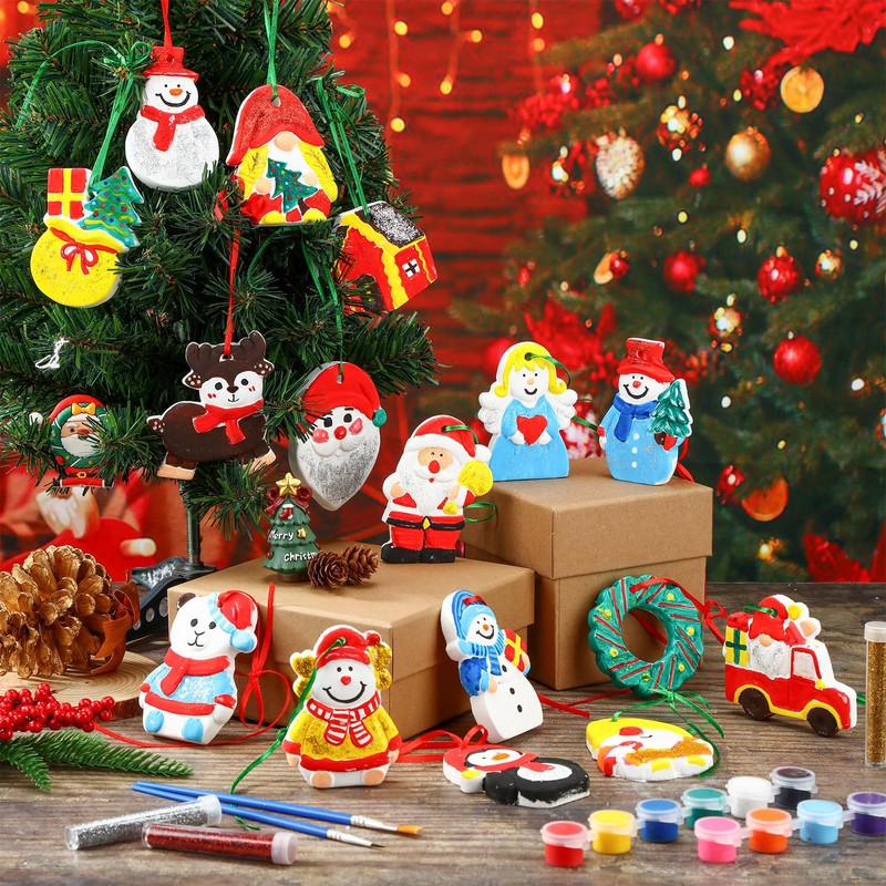 - Fun DIY Project: the figure painting kit is filled with various elements of Christmas, such as Santa Claus, snowman, snowflake, dwarf, Christmas tree, etc.; Kids can enjoy hours of color mixing fun by drawing their own ceramic figures; They can hang them on Christmas trees, backpacks, windows, bedside tables, and any other places that can be decorated with ornaments