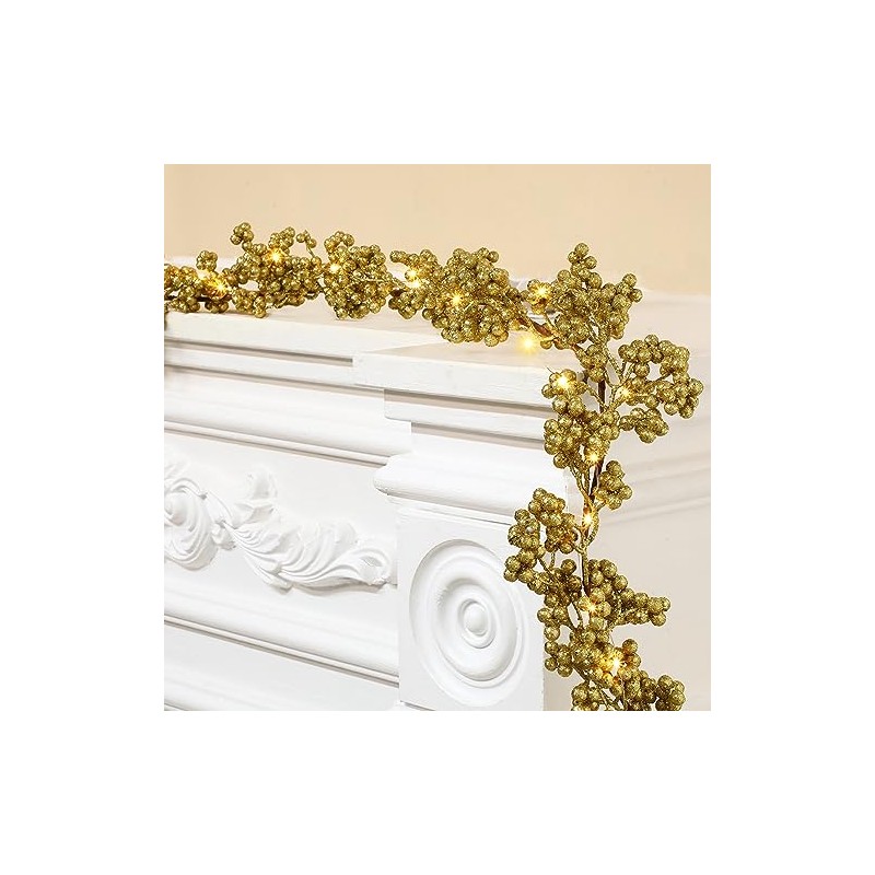 - Lighted Gold Glitter Berry Garland: this Christmas gold glitter berry string light has a LED light and is filled with gold glitter berries, this gold glitter berry string light is 6 feet long and is ideal for adding a festive atmosphere anywhere in the home, the light is directly connect to the gold glitter berry garland