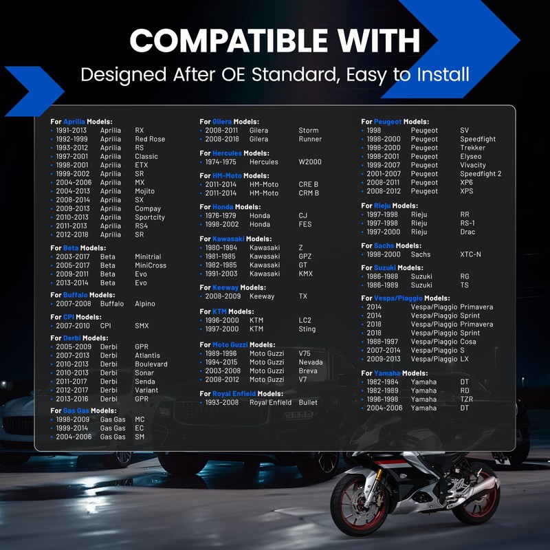 • 【Perfect Fit】Spark plugs Compatible with Aprilia Gilera Piaggio Vespa/Piaggio Beta Derbi Moto Guzzi Gas Gas HM-Moto Peugeot CPI Keeway Buffalo Royal Enfield Yamaha Kawasaki Honda KTM Rieju Sachs Suzuki Hercules. For more information about the fit, please check the picture or detail page. Note: Please verify your vehicle's make, model, and engine size before purchasing to ensure compatibility.