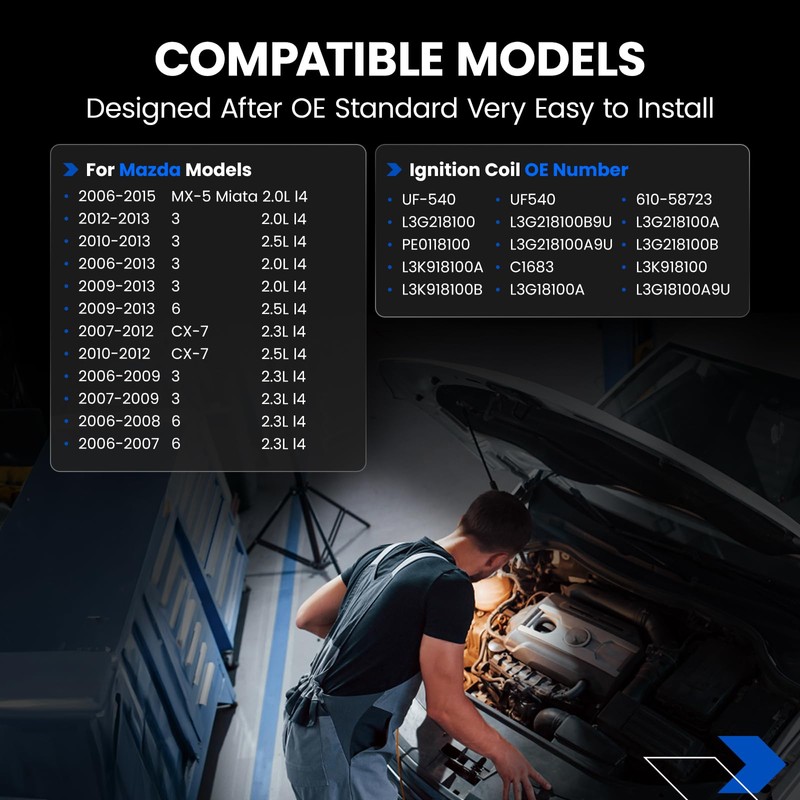 - 【Compatibility】The Coil Pack UF540 Compatible with 2006-2008 Mazda 6 2.3L l4, 2006-2009 Mazda 3 2.3L l4, 2006-2013 Mazda 3 2.0L l4, 2006-2015 Mazda MX-5 Miata 2.0L l4, 2007-2009 Mazda 3 2.3L l4, 2007-2012 Mazda CX-7 2.3L l4, 2009-2013 Mazda 3 2.0L l4, 2009-2013 Mazda 6 2.5L l4, 2010-2012 Mazda CX-7 2.5L l4, 2010-2013 Mazda 3 2.5L l4, 2012-2013 Mazda 3 2.0L l4. For more information, please check the pictures or the item detail page.