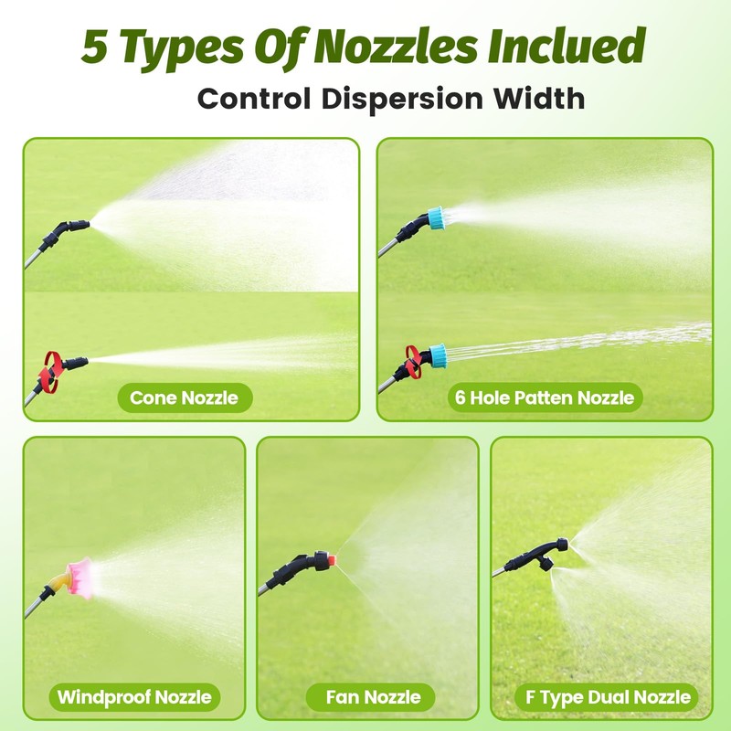 - đ ă 4 nozzles & 40" Extended Reach Power SprayerăEquipped with 3 adjustable spray patterns and 4 nozzles, this electric sprayers in lawn and garden adapts to any garden task, Whether for spraying delicate plants with fine mist or giving the lawn a powerful spray. The 40" wand and long hose deliver a wide spray area, making it an excellent backpack sprayer battery powered sprayer for hard-to-reach spots