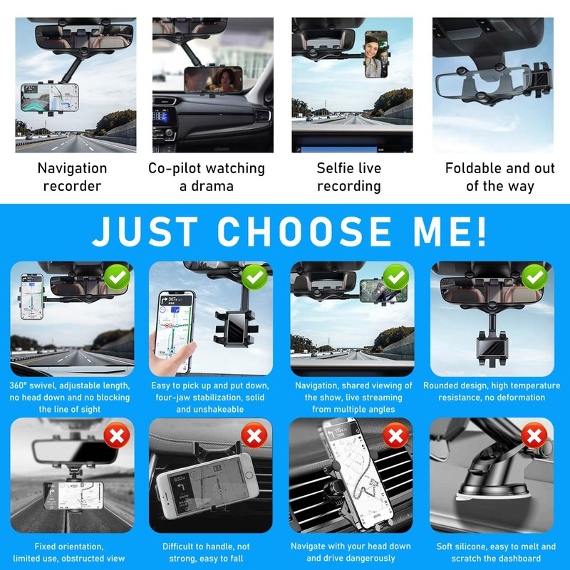 - 【Improving Security】: Using our car mirror cell phone holder, you can adjust the telescopic pole of the cell phone holder to be at eye level to ensure that your eyes are always focused on the road in front of you. Moreover, it will not block your view and can improve driving safety.
