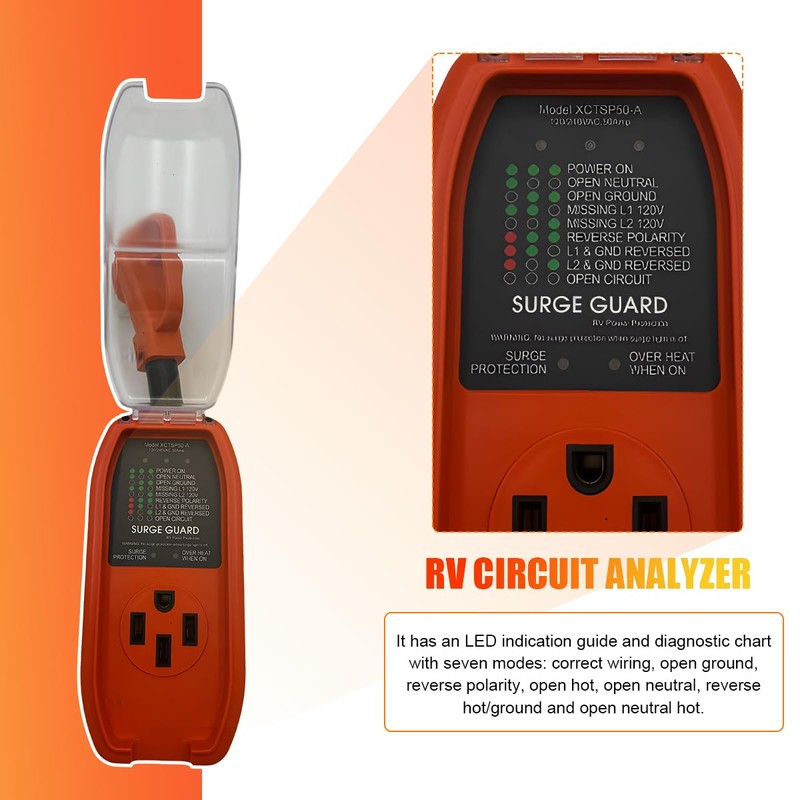Sylvil RV Surge Protector, 50 Amp RV Circuit Analyzer Surge Guard Full Protection, Smart RV Surge Protector with Waterproof Cover for RV, Camper, Trailer, Truck, Car Accessories (Orange)