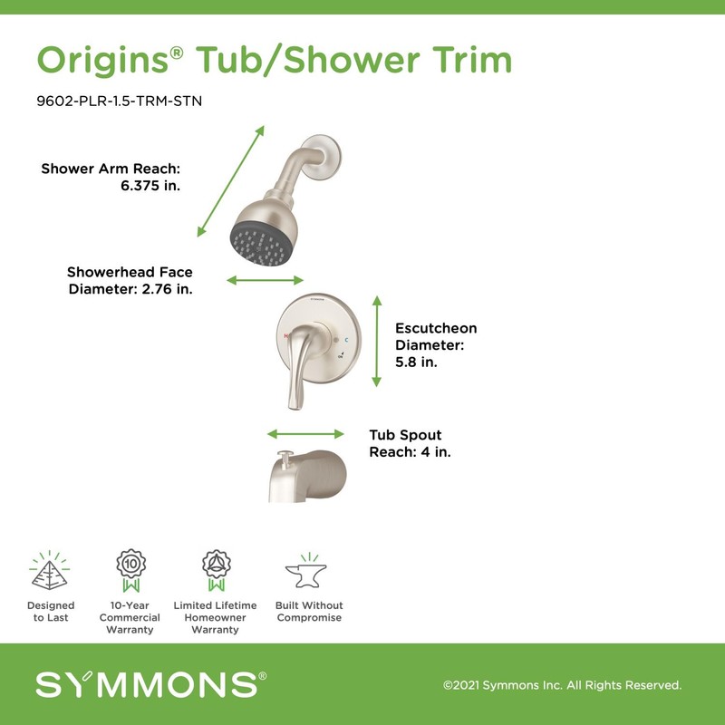 Symmons 9602-PLR-1.5-TRM-STN Origins Single Handle 1-Spray Tub and Shower Faucet Trim in Satin Nickel - 1.5 GPM (Valve Not Included)