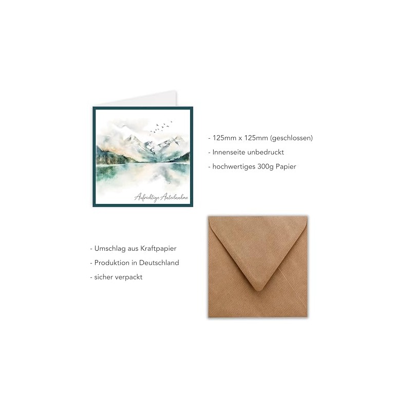 This dignified square mourning card in the format 125mm x 125mm offers a soulful and respectful way to express sincere sympathy in times of loss. On the front you can see the lettering "Sincere Anteilnahme", which lies above a soothing image of a valley lake with majestic mountains in the background in a soft watercolour look. An elegant frame in a deep dark green borders the image, giving the card a calm and dignified radiance. Printed on 300gsm premium paper, which gives the card a high quality and durability. The robust nature of the paper ensures that this card not only conveys a message of compassion, but can also serve as a lasting sign of memory. A matching kraft envelope completes the overall look and highlights the natural elegance of the card. This sympathy card is ideal for giving support and comfort to friends, family members or colleagues in times of mourning. It is suitable for expressing condolences after a death, but can also be given on the anniversary of a loss or at memorial events. The card offers a silent and respectful way to show compassion and sympathy. It can help to provide support and comfort in difficult times and shows in an empathetic way that you are in thoughts with the bereaved. With its calm and contemplative design, this sympathy card is a sign of solidarity and remembrance.