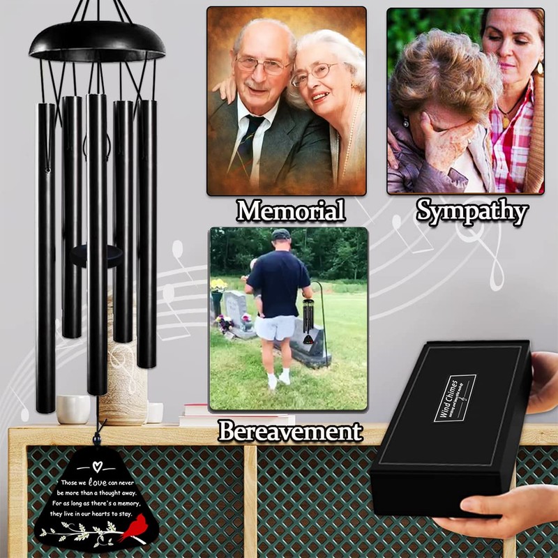 - 【Soothing relaxing deep tones】Few things compare to the pain of losing someone you love.Wind chimes for loss of loved one is 30 inches long from the hook to the bottom of the wind catcher. The length of the five black aluminum tubes varies from 10 inches to 14 inches,Strict size to grasp the accuracy of the tone.The beautifully designed black box, each aluminum tube is firmly wrapped with kraft paper, The unique tag testimonials make this cardinal gift give unique power to the bereaved.