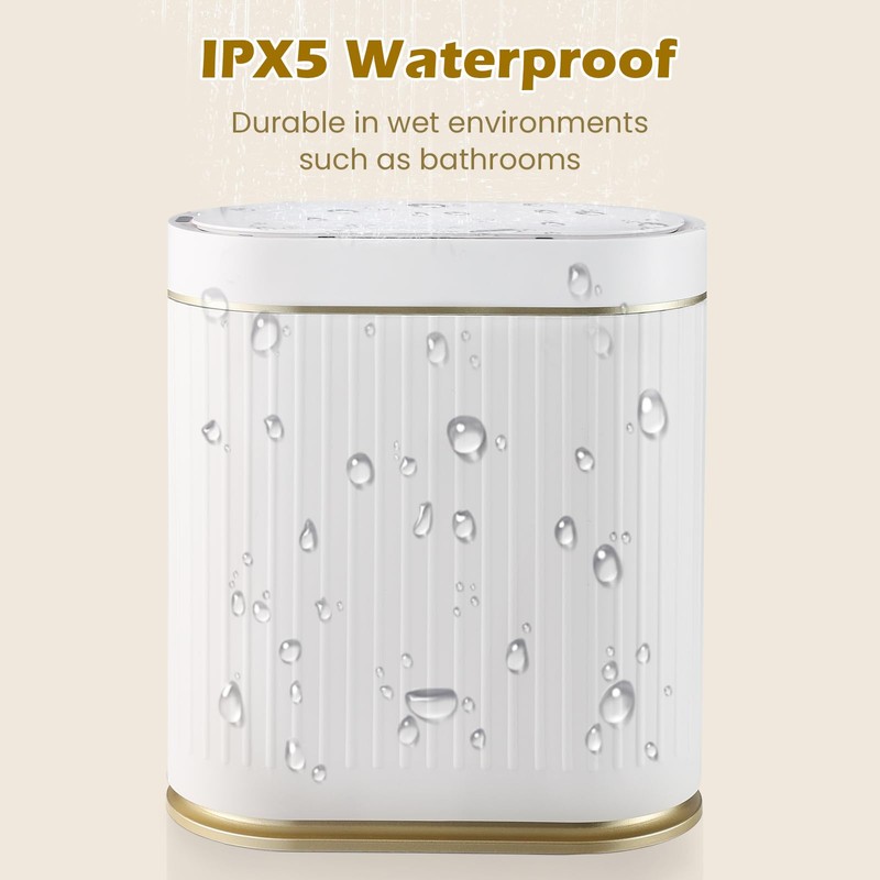 • IPX5 Waterproof - This sensor trash bin is perfectly suited for humid environments like bathrooms. It resists water splashes and prevents moisture from affecting the mechanism of lid. A quick wipe keeps it clean, with no water stains left behind.