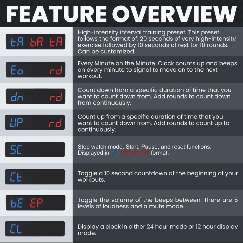 • ★ PREPROGRAMMED & CUSTOMIZABLE ★ – This timer comes preprogrammed with the most utilized timer settings: 10 and 20 minute Tabata; 10 or 20 min EMOM; and Count up/Down. We know from our experience as gym owners and trainers which functions are necessary for you! Every function is totally customizable to time the exact rounds, minutes, and seconds your training requires.