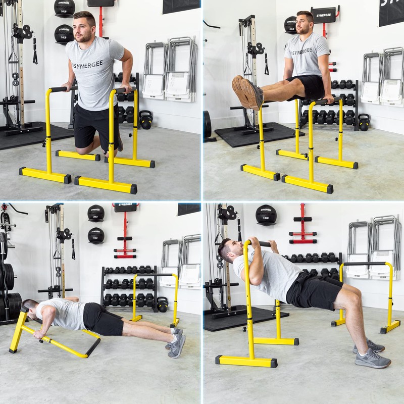 • ★ COMPLETE PORTABLE DIP STATION ★ – The Synergee Dip Station provides everything you need to perform dips, inverted pull-ups, L sits, and callisthenic movements anywhere! From beginners to advanced athletes, everyone will be able to use this dip station for their workouts and feel the burn. Whether it’s at home, outside, or at the gym, this dip bar delivers.