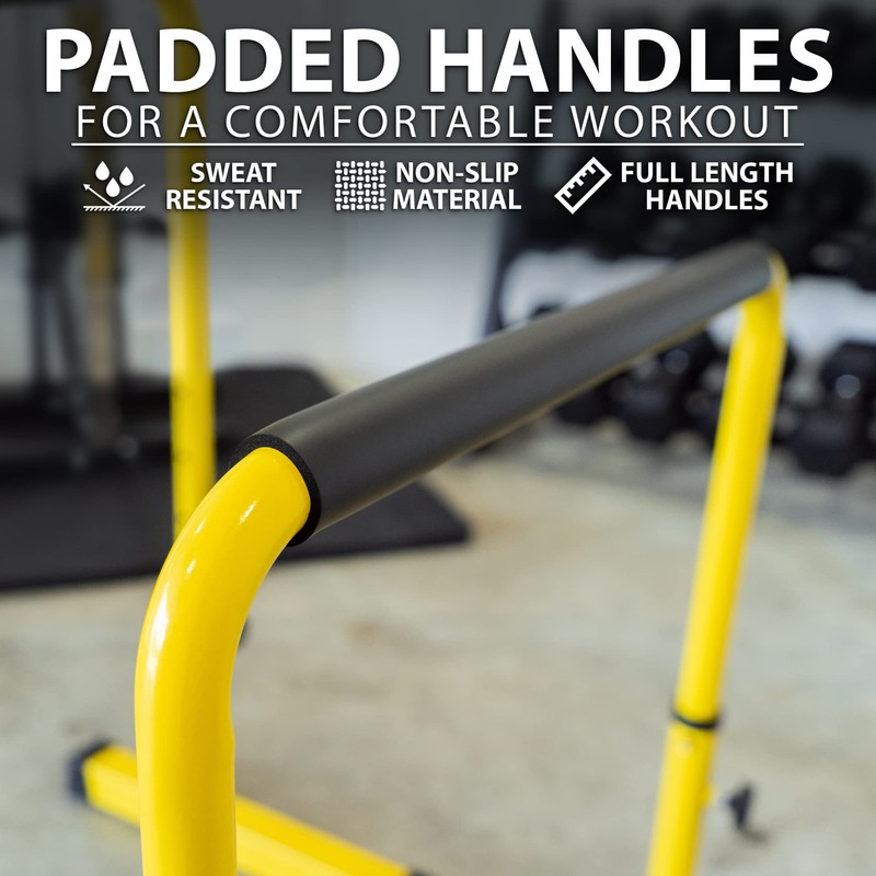 Synergee Dip Bar Yellow. Adjustable Dip Station from 30” – 39” for Dips, Inverted Pull Ups. Max capacity 400 lbs. Portable Dip Stand for Total Body Workout.