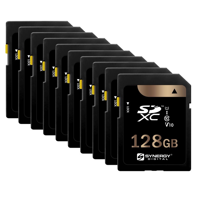 Synergy Digital 128GB Secure Digital SDXC UHS-I Memory Cards, Compatible with Sony PXW-Z90V 4K HDR XDCAM Camcorder - Class 10, U1, 100MB/s, 300 Series - Pack of 10