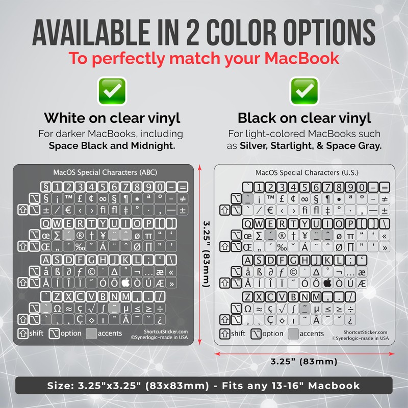 This sleek and practical sticker is designed to fit perfectly in the area next to the trackpad on any MacBook. It showcases a comprehensive guide to macOS special characters, featuring keyboard combinations using the Option and Shift keys. In addition to punctuation, currency, and mathematical symbols, the sticker also includes key combinations for typing accented characters (such as á, é, í, ó, ú, ü, ñ) —making it an invaluable tool for multilingual users. Crafted with a durable, laminated surface, the sticker resists scratches and fading, ensuring it stays clear and vibrant over time. Its minimalist design enhances the MacBook aesthetic, with symbols arranged in a tidy grid format and shortcut keys clearly labeled for quick reference. The sticker is available in two color options to perfectly match your MacBook: Black on clear vinyl for light-colored MacBooks such as Silver, Starlight, and Space Gray. White on clear vinyl for darker MacBooks, including Space Black and Midnight. Additionally, the sticker is tailored for two keyboard layouts to suit your needs: U.S. English ABC English (International) Equipped with a no-residue adhesive, the sticker is easy to apply, stays securely in place, and removes cleanly without leaving marks. Ideal for developers, designers, writers, and power users, this sticker is a stylish and functional accessory that enhances your MacBook experience while boosting productivity.
