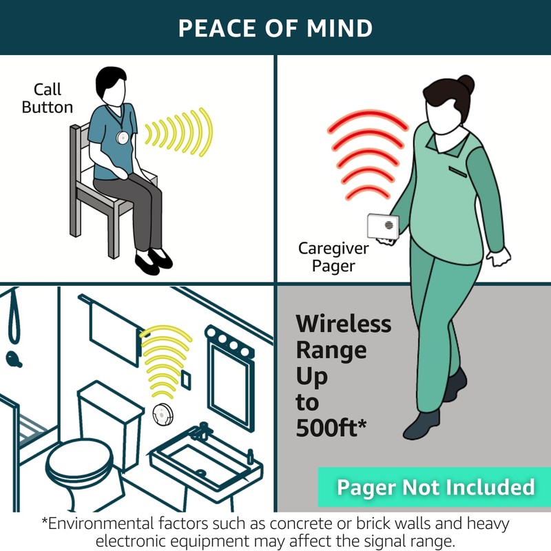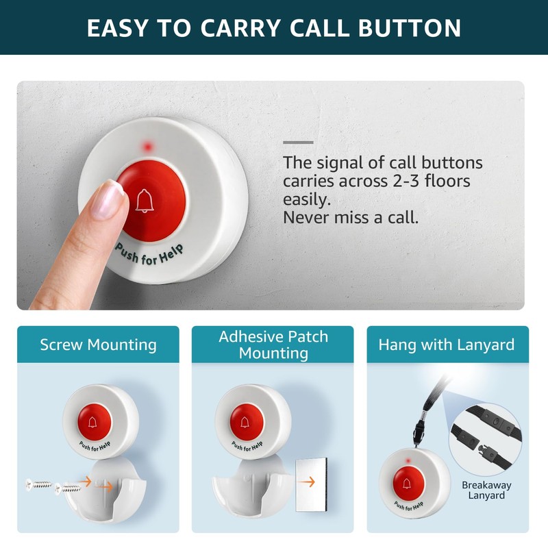 - CONVERTIBLE FEATURE: The call button comes with a mounting bracket that allows it to fix to a wall at bedside/in bathroom or affix to most smooth and clean surfaces with adhesive tapes/screws provided. Attach with the lanyard provided to wear around the neck as a pendant.