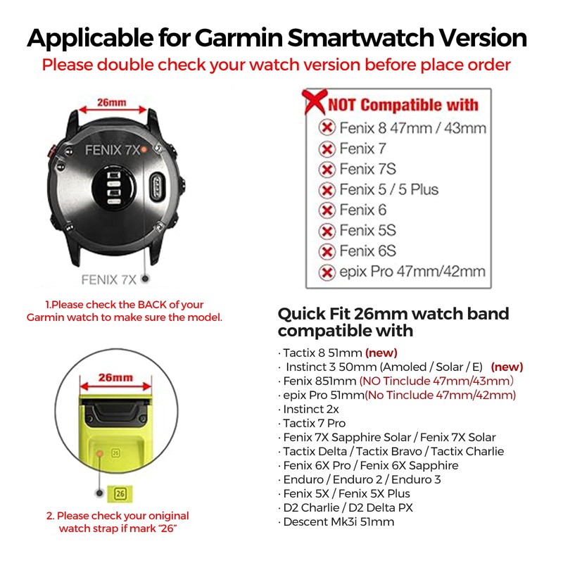 - 26MM GARMIN BAND COMPATIBLE DEVICE:This 26mm Titanium Replacement Band is compatible with Garmin Fenix 7X/7X Solar/7X Sapphire Solar / 7X Pro / 7X Pro Sapphire Solar / 6X / 6X Pro / 6X Pro Solar / 6X Sapphire / Fenix 5X / 5X Plus / Fenix 3/ 3 HR / Instinct 2X / Epix Pro 51mm / Enduro / Enduro 2 / Descent Mk1 Mk2 Mk2i Mk3i 51mm / D2 Delta PX / D2 Bravo/D2 Charlie/Tactix 7/Tactix 7 Pro/Tactix Delta/Tactix Bravo/Tactix Charlie /Foretrek 601 701/Quatix 3/ epix Pro (Gen 2 51mm)