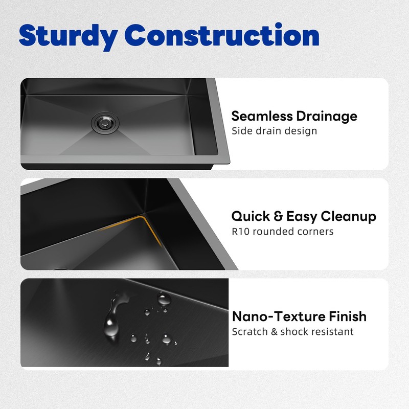 - Durable Nano Coating: Featuring a sleek gunmental black PVD finish, this undermount sink resists corrosion and scratches, staying fingerprint and water-stain-free to maintain its modern appeal. the color may appear different under varying lighting conditions