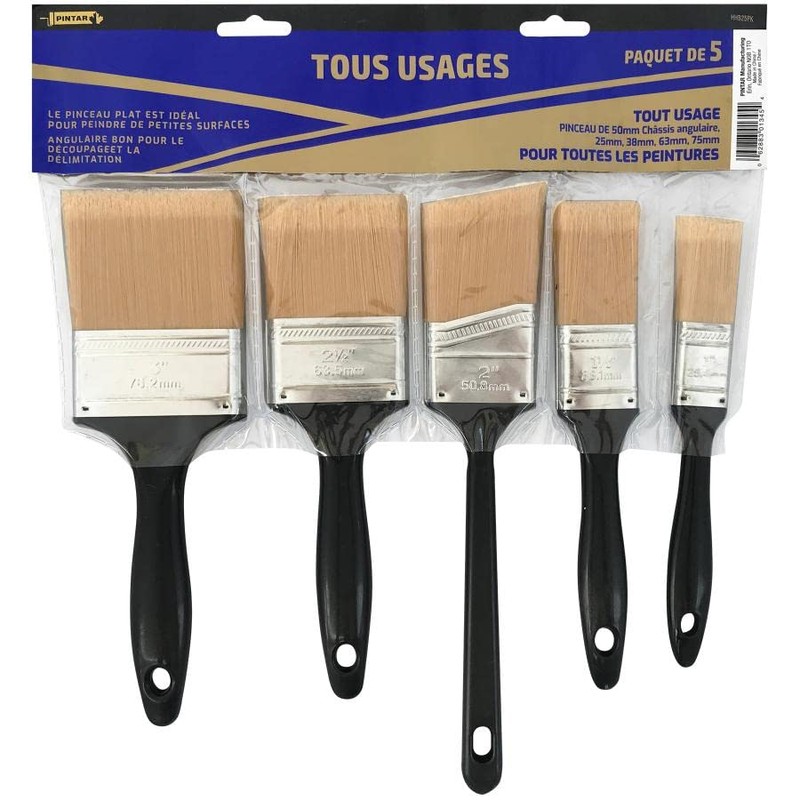 - Includes (1) 2" angular sash brush; (1) 1" flat brush; (1) 1-1/2" flat brush; (1) 2-1/2" flat brush; (1) 3" flat brush